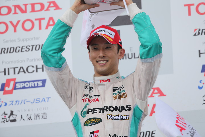 表彰式で優勝の中嶋一貴(PETRONAS TOM’S SF14)