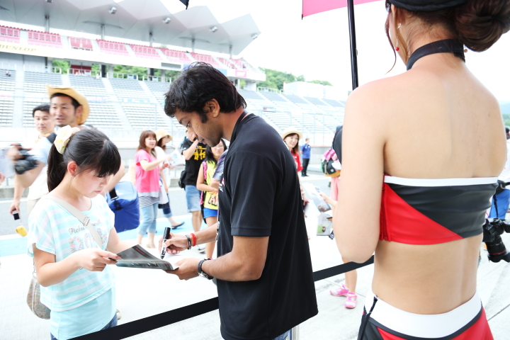 キッズピットウオーク: サインをするクマール・ラム・ナレイン・カーティケヤン(Lenovo TEAM IMPUL SF14)