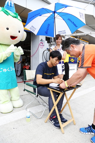 ピットウォーク: おじさんにサインをする平川亮(ACHIEVEMENT Team KYGNUS SUNOCO SF14)