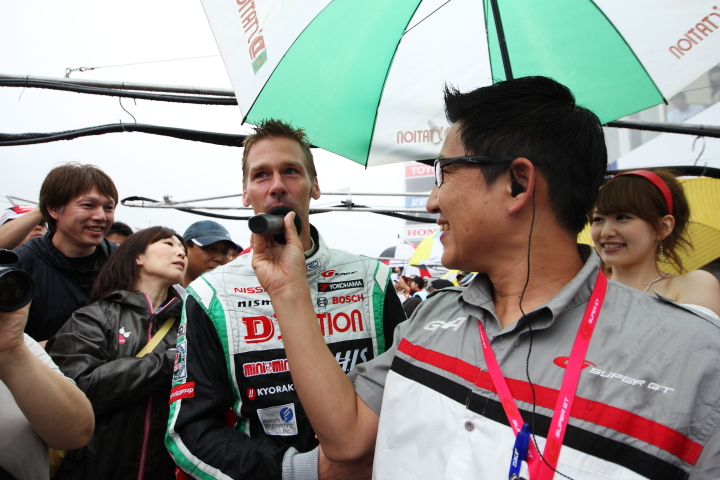 無料ピットウォーク: ピエール北川アナウンサーにインタビューを受けるミハエル・クルム(GT500:D'station ADVAN GT-R)