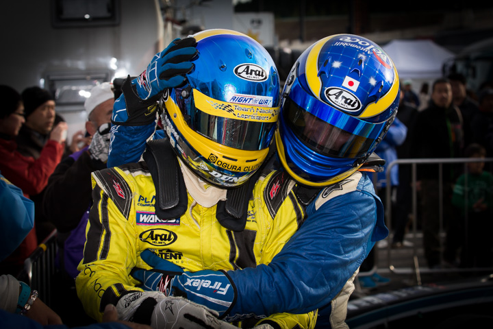 健闘をたたえ合え抱き合う優勝した伴貴広と2位の山口大陸、TAIROKU EXCEEDのチームメート同士