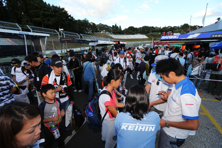 GTキッズウォーク: 子どもにサインをする塚越広大(KEIHIN REAL RACING)