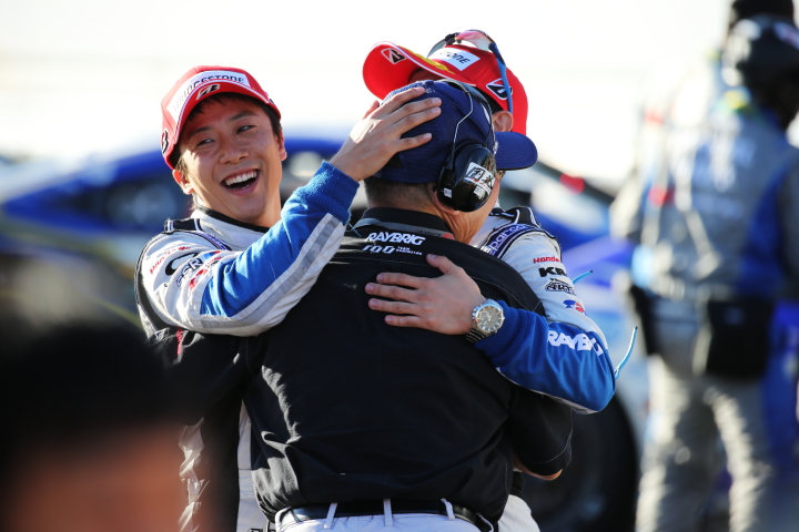 決勝レース: GT500クラスで優勝し抱き合う伊沢拓也・山本尚貴・高橋国光監督(TEAM KUNIMITSU)