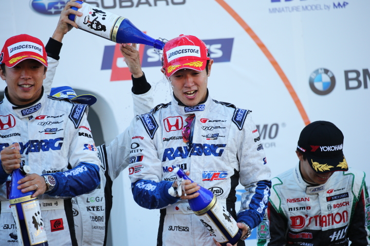 表彰式: シャンパンファイトはGT500クラスで優勝した伊沢拓也(左)と山本尚貴(右)