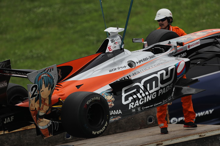国本雄資が1コーナーでスピン。コース上にストップしたため回収作業が行われた