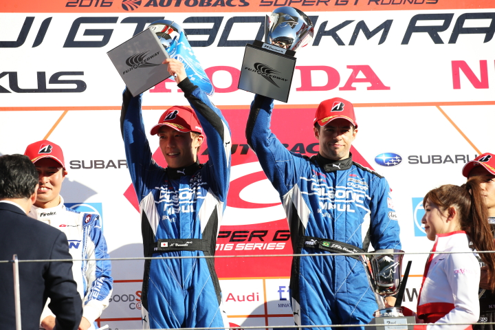 表彰式: GT500クラス優勝の安田裕信とジョアオ・パオロ・デ・オリベイラ(TEAM IMPUL)