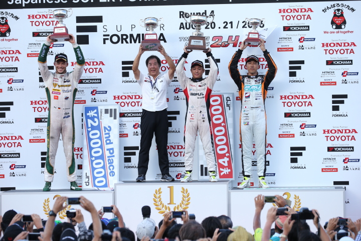 表彰式: 優勝した関口雄飛(中右)、2位・アンドレ・ロッテラー(左)、3位・石浦宏明(右)
