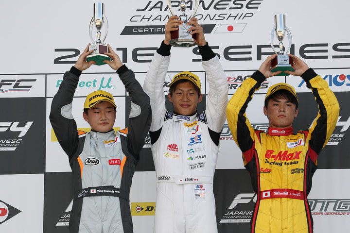 表彰式: 優勝・大滝拓也(中央)、2位・角田裕毅(左)、3位・澤田真治(右)