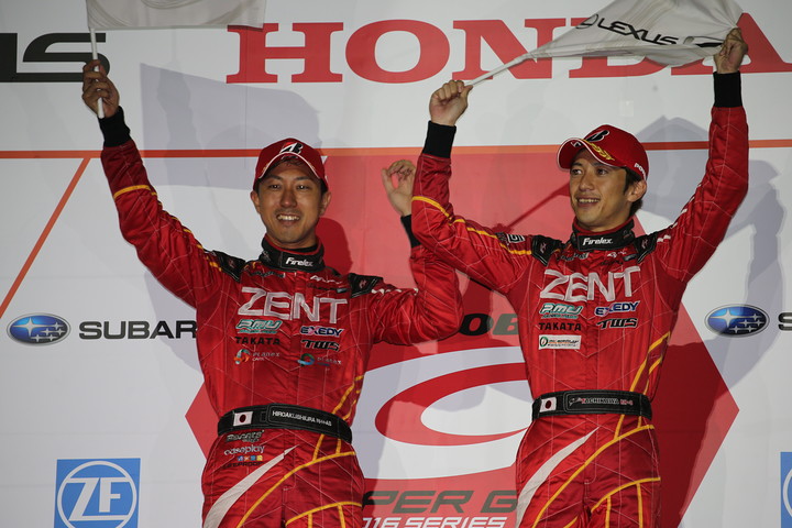 表彰式: GT500クラスで優勝した立川祐路/石浦宏明組(LEXUS TEAM ZENT CERUMO)