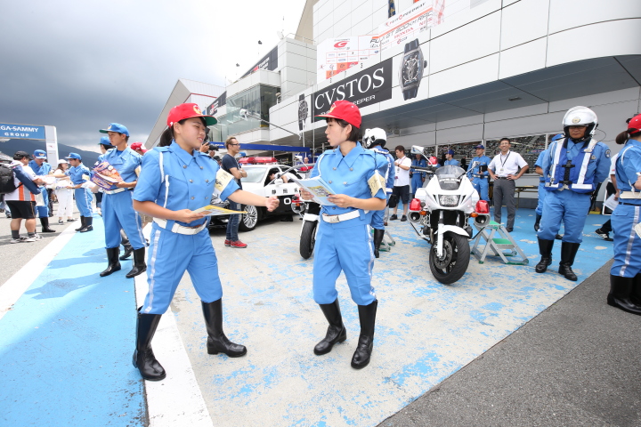スタート前にパレードラップを行う白バイ隊員の打ち合わせ「こけないでね」