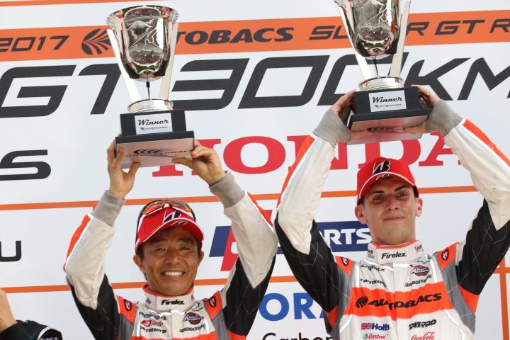 表彰式: GT300クラスウィナーの高木真一とショーン・ウォーキンショー(AUTOBACS RACING TEAM AGURI)