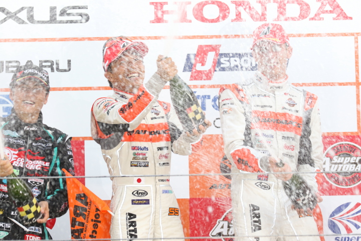 表彰式: シャンパンファイトを行う高木真一とショーン・ウォーキンショー(AUTOBACS RACING TEAM AGURI)