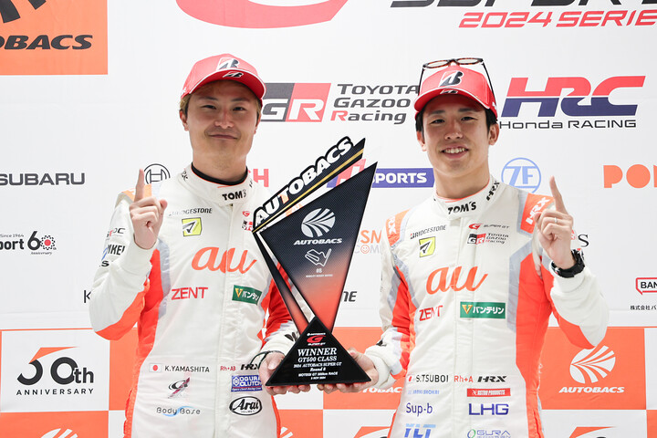 GT500クラスの表彰式:優勝した坪井翔/山下健太組(TGR TEAM au TOM'S)