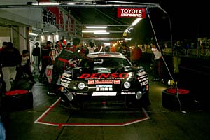 コースを闇が包み、各車ライトを点灯しての夜間走行となったが、トヨタ スープラ HV-Rは首位の座を固め、午後7時45分(4時間45分経過)、123周目にピットイン。4番手ドライバーの片岡龍也へとドライバーチェンジ、ウェットタイヤに履き替え、給油を行って再び首位でコースへと復帰した。